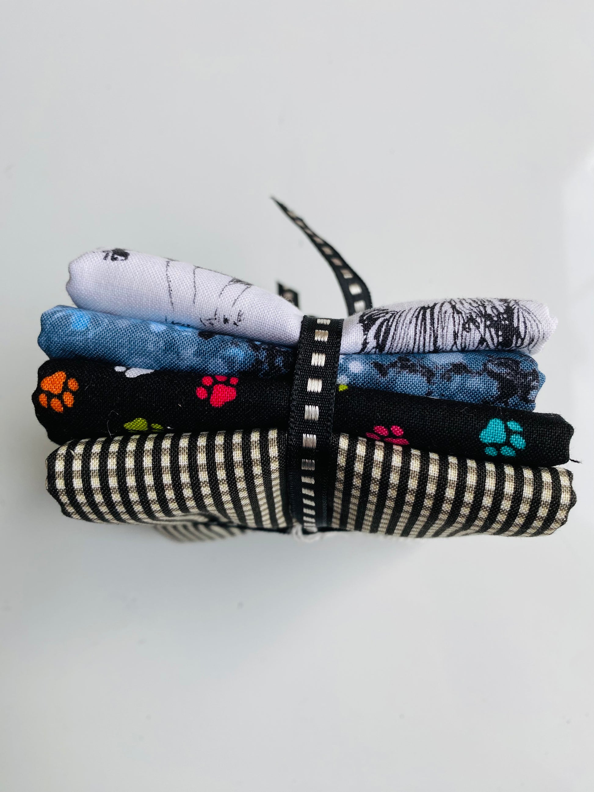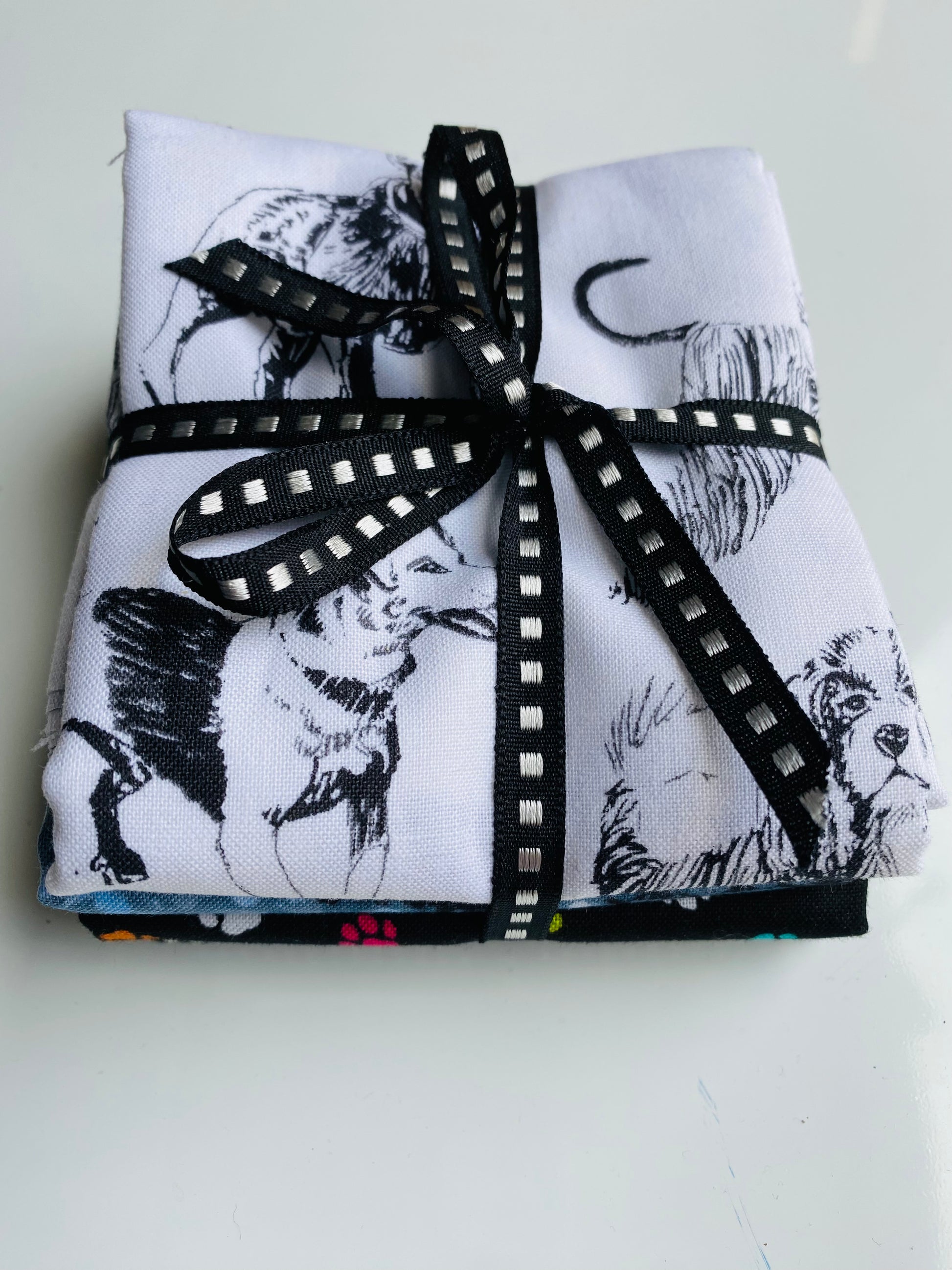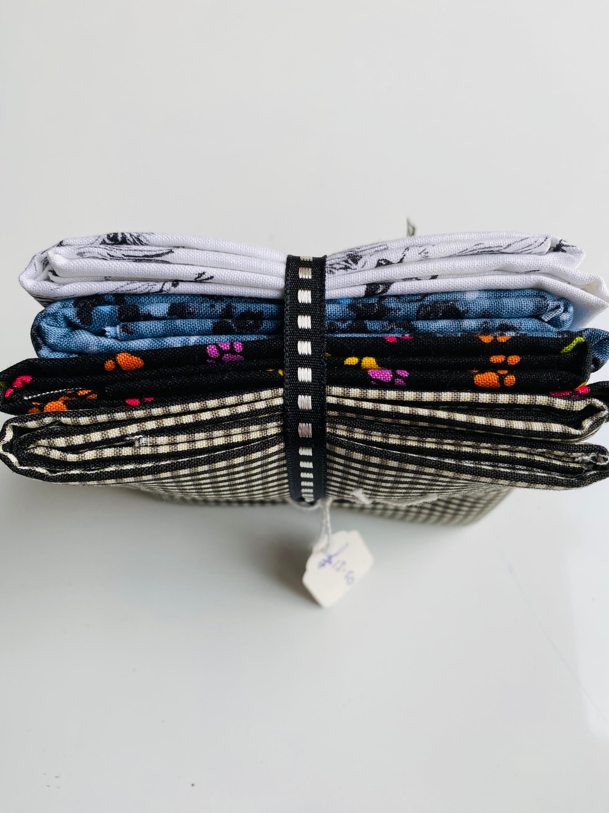 Please note that the supply of doggy fabric - the colours, patterns and style of fat quarter packs will vary depending on availability in the shop on the day of the order but will be packaged as shown.