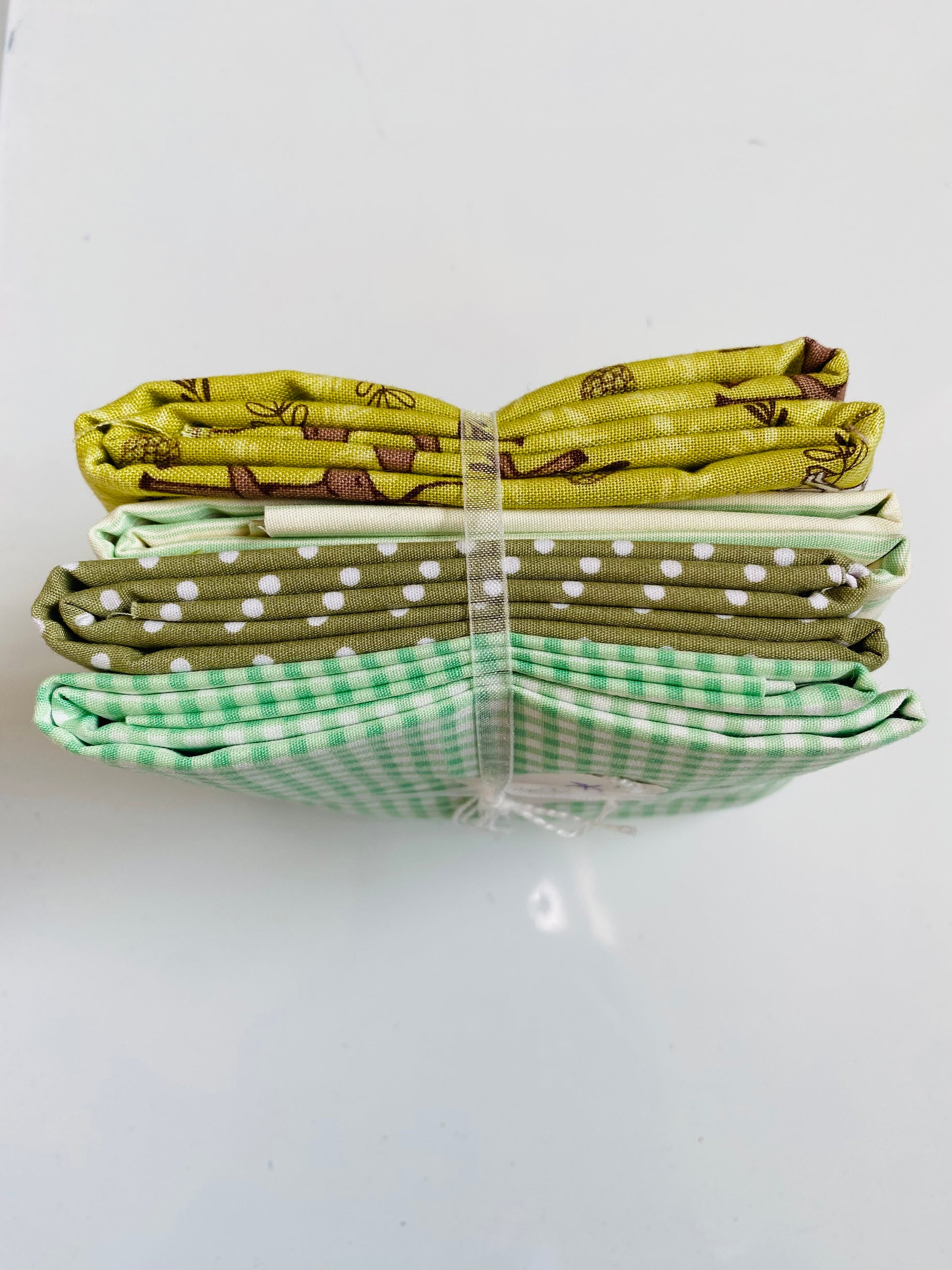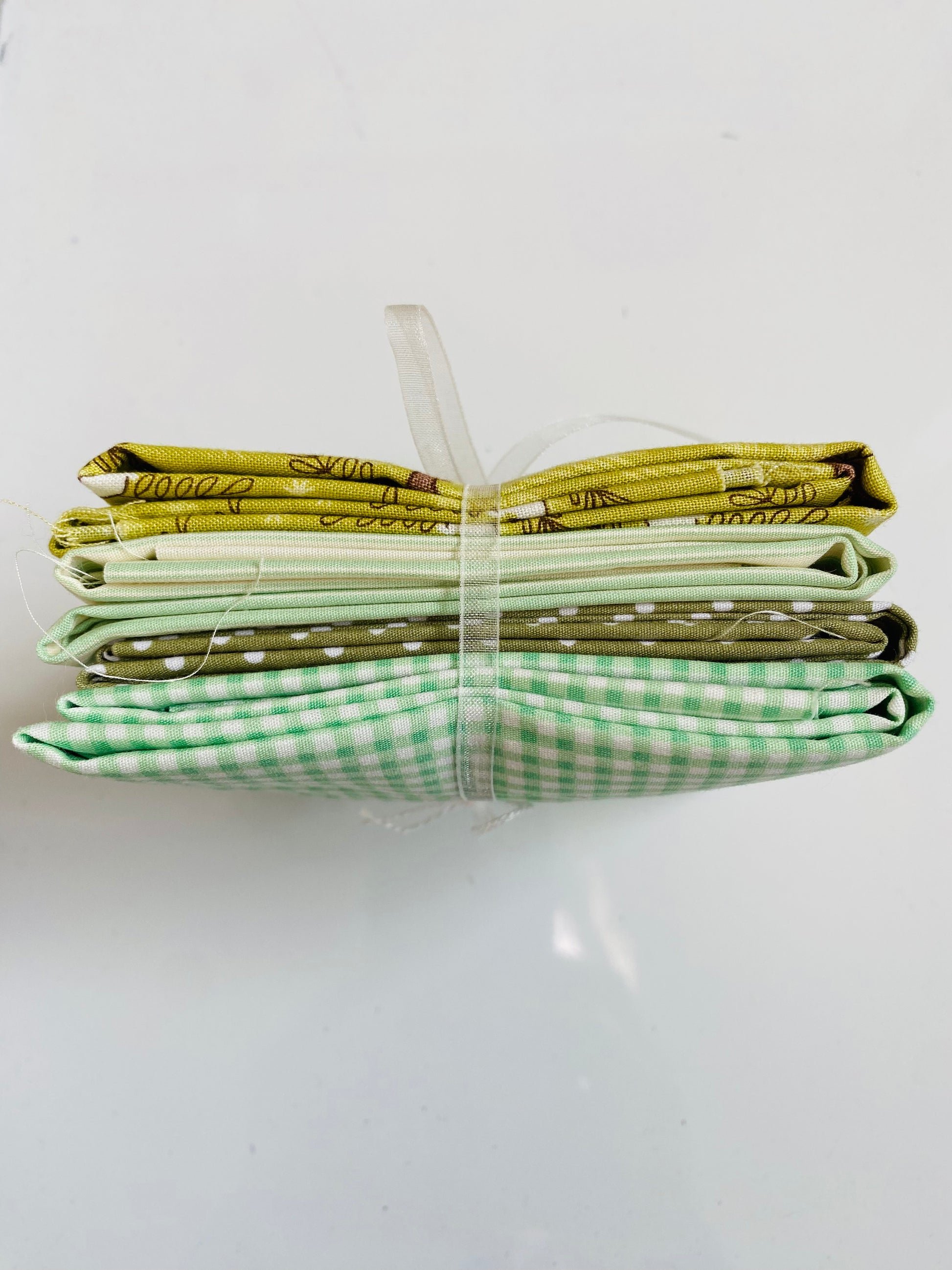 Please note that the supply of green fabric - the colours, patterns and style of fat quarter packs will vary depending on availability in the shop on the day of the order but will be packaged as shown.